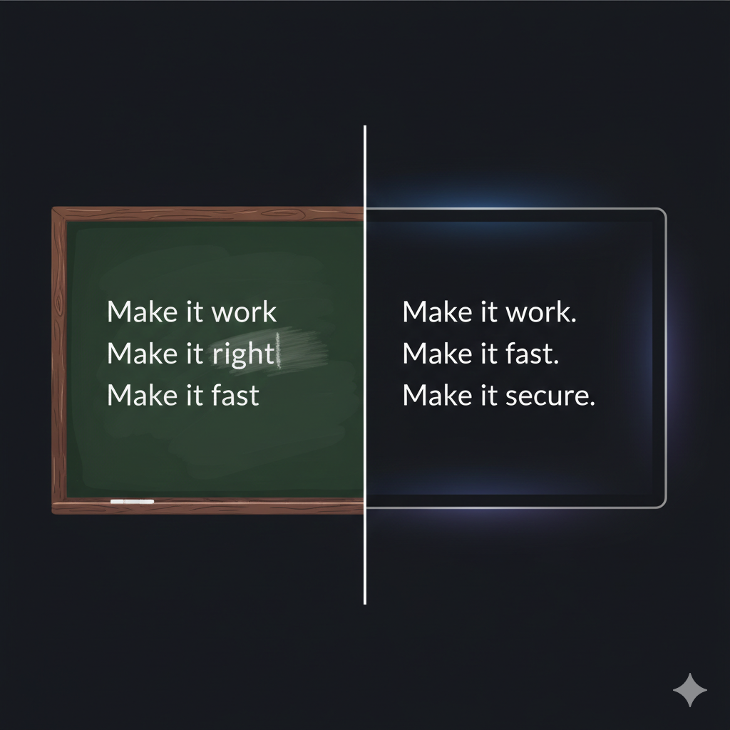 There's an old saying: "Make it work, make it right, make it fast." The idea was that you'd iterate. Get something functional, then clean it up, then optimise. But "make it right" always meant making it readable, maintainable, well-structured for humans. With AI agents, "make it work" and "make it right" are collapsing into a single step. Claude doesn't need a messy first draft followed by a careful refactor. It just writes the thing. Which means maybe the new version is simpler: "Make it work. Make it fast. Make it secure."